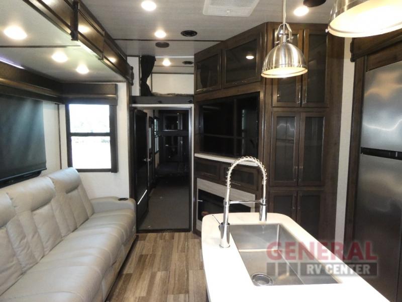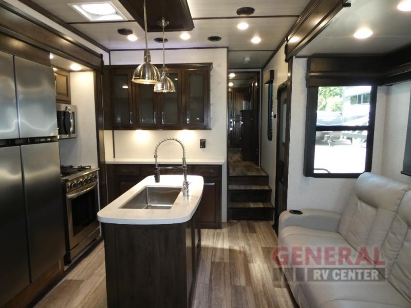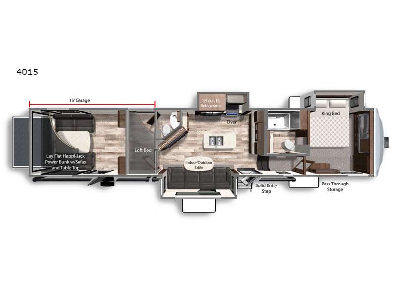 Inside, you'll find accommodations to sleep up to eight people, making it ideal for family vacations or trips with friends. The well-appointed interior features modern amenities and high-quality finishes, ensuring a comfortable and enjoyable stay. Whether you're cooking in the fully equipped kitchen or relaxing in the cozy living area, this RV is designed to meet all your needs. The Voltage 4015 also includes a large garage space, perfect for storing your outdoor gear or converting into additional living space.