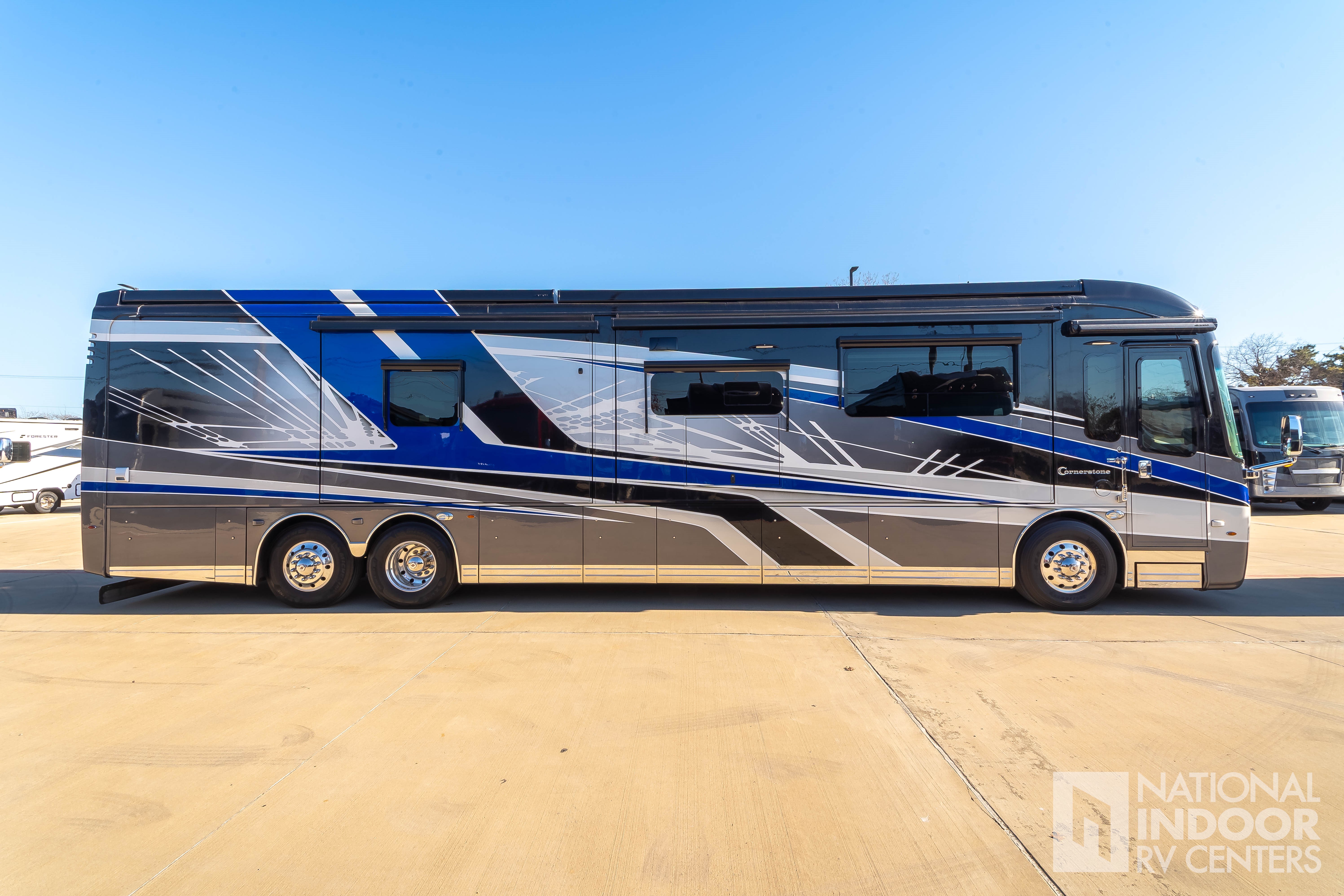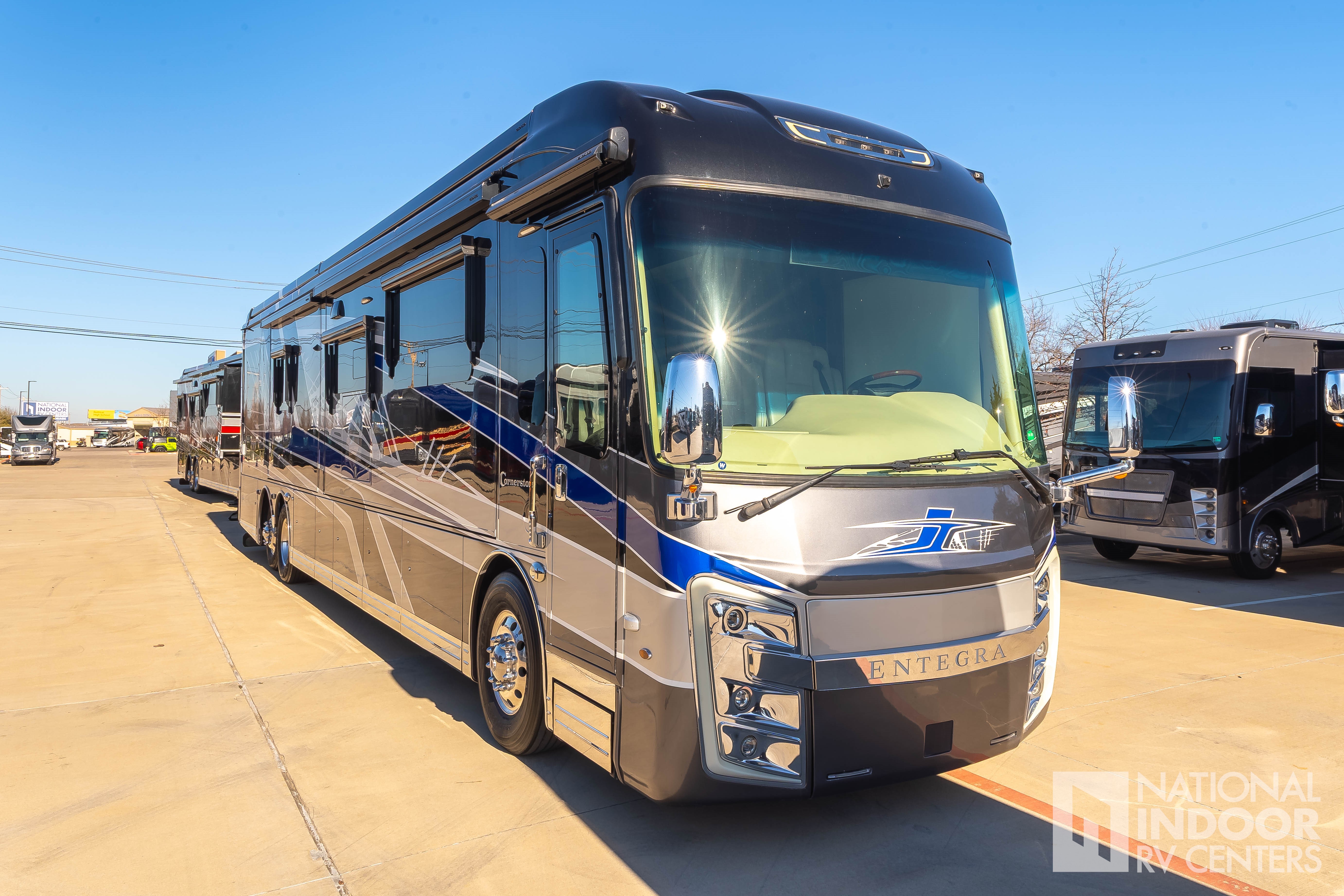 The Entegra Cornerstone 45B features four expansive slide-outs, ingeniously designed to maximize interior space and enhance your living experience. These slide-outs create a spacious and inviting environment, perfect for entertaining guests or enjoying a quiet evening with family. The interior is adorned with high-quality finishes and state-of-the-art amenities, ensuring that every journey is as comfortable as it is memorable. From the fully-equipped kitchen to the luxurious master suite, every detail has been thoughtfully considered to provide the ultimate in convenience and relaxation.
