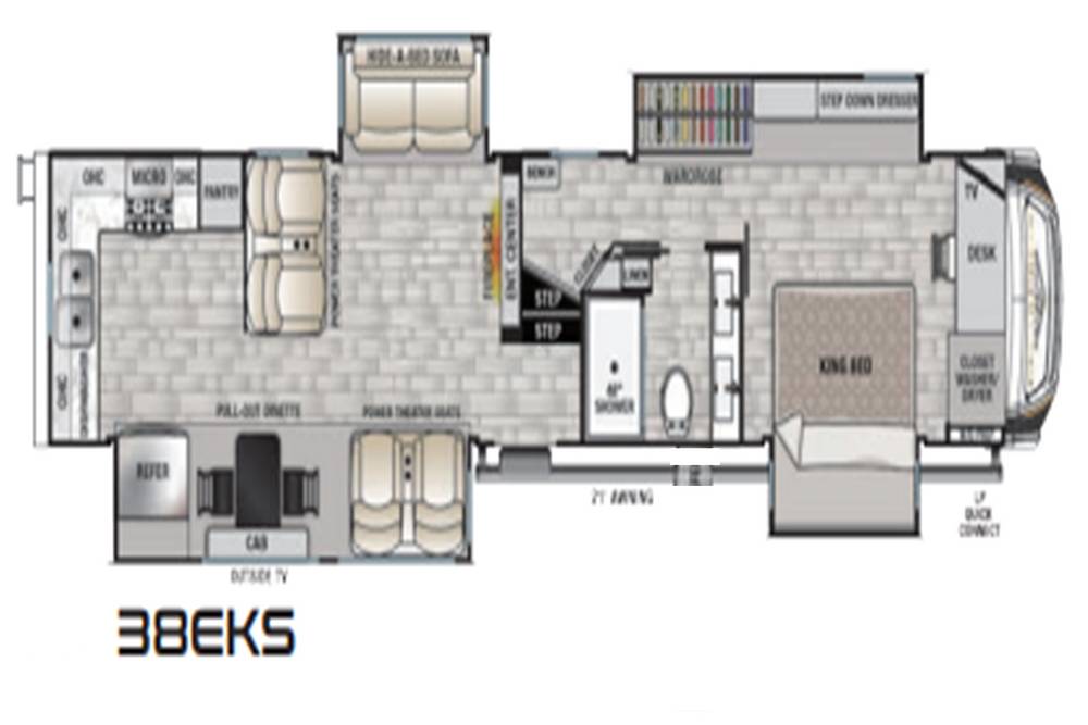 Measuring approximately 36 feet in length, the Cedar Creek Champagne 38EKS offers an expansive living space that includes a beautifully appointed kitchen, complete with high-end appliances and ample storage. The elegant living area features plush seating and a state-of-the-art entertainment system, making it an ideal spot to relax after a day of exploration. The master bedroom is a haven of tranquility, boasting a luxurious king-size bed and plenty of wardrobe space, while the additional sleeping area ensures everyone has a cozy place to rest.