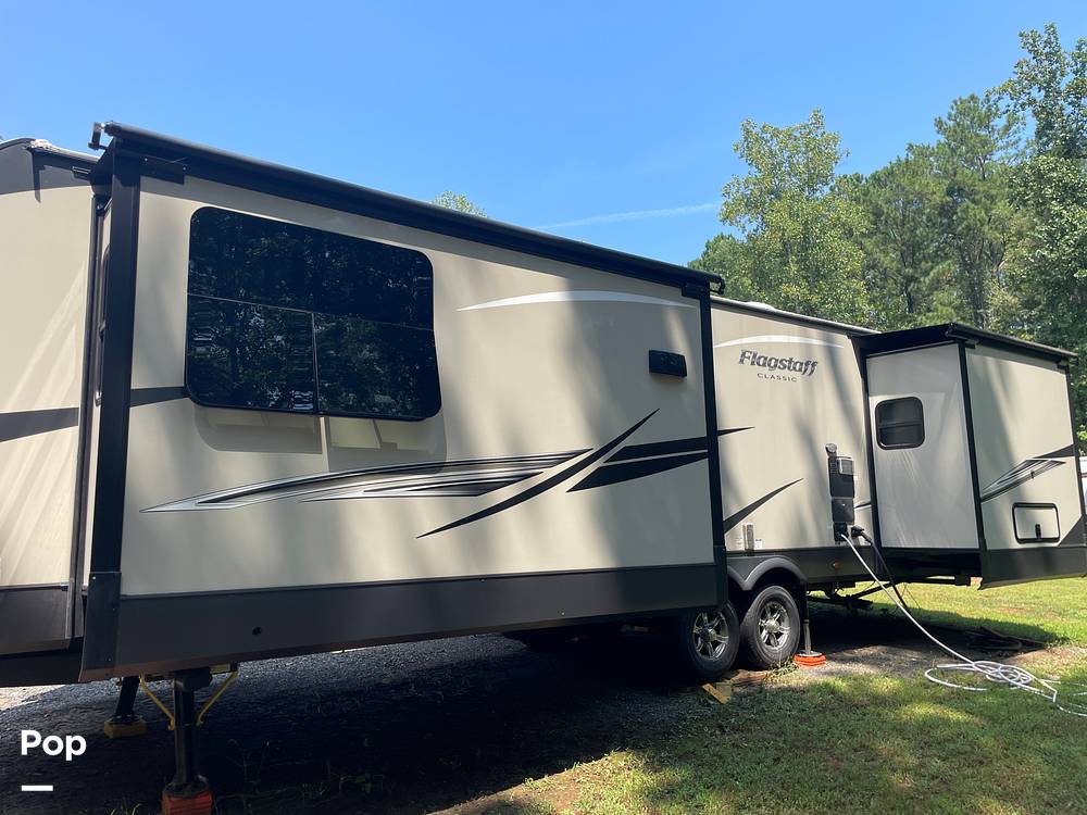 Measuring approximately 31 feet in length, the Flagstaff 832FLSB provides ample space for all your travel needs. Inside, you'll find a well-appointed living area featuring plush seating and a modern entertainment system, perfect for relaxing evenings. The fully equipped kitchen comes with state-of-the-art appliances, allowing you to prepare delicious meals on the go. The elegant dining area offers a welcoming space for family meals or game nights.
