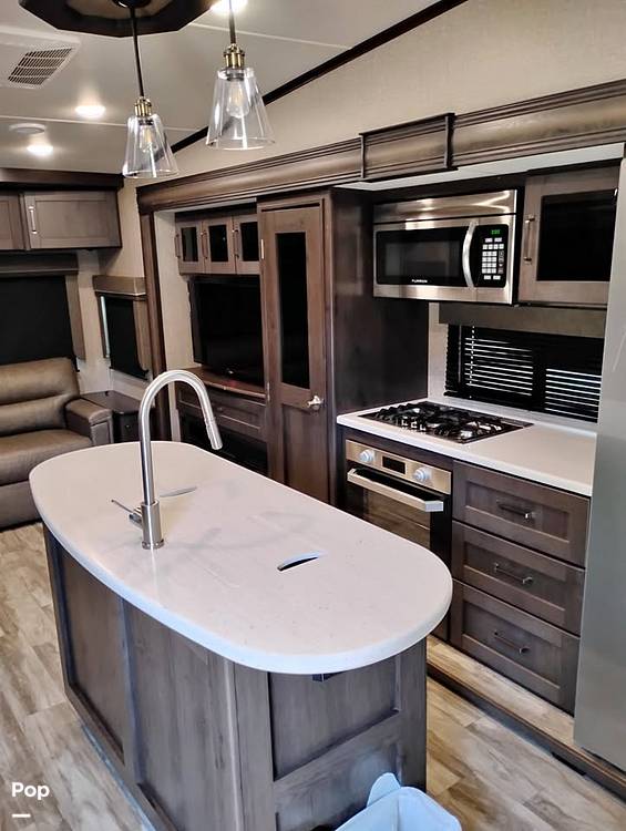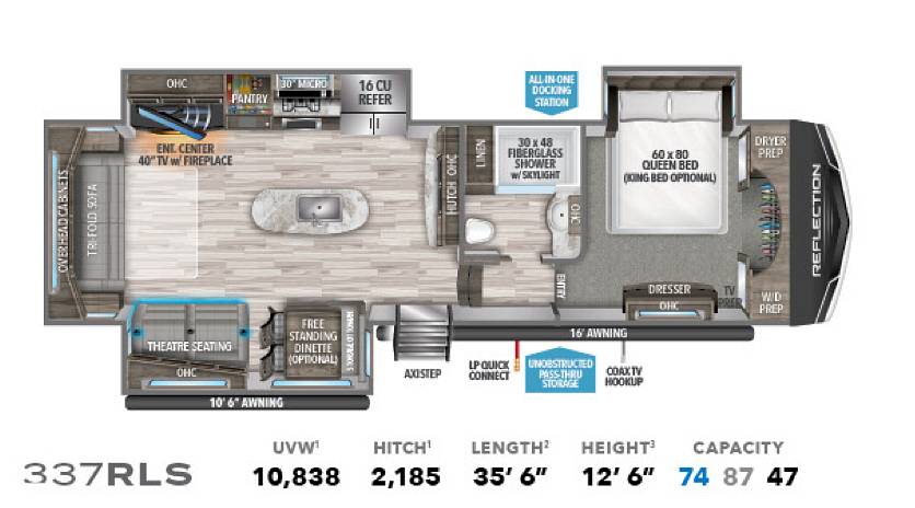 Measuring approximately 28 feet in length, the Reflection 337RLS offers ample space for relaxation and entertainment. Inside, you'll find a beautifully appointed living area featuring plush seating and a state-of-the-art entertainment system, perfect for unwinding after a day of exploration. The fully equipped kitchen boasts modern appliances and plenty of storage, making meal prep a breeze. Enjoy your culinary creations at the elegant dining area, or take the feast outside under the stars.