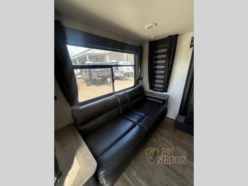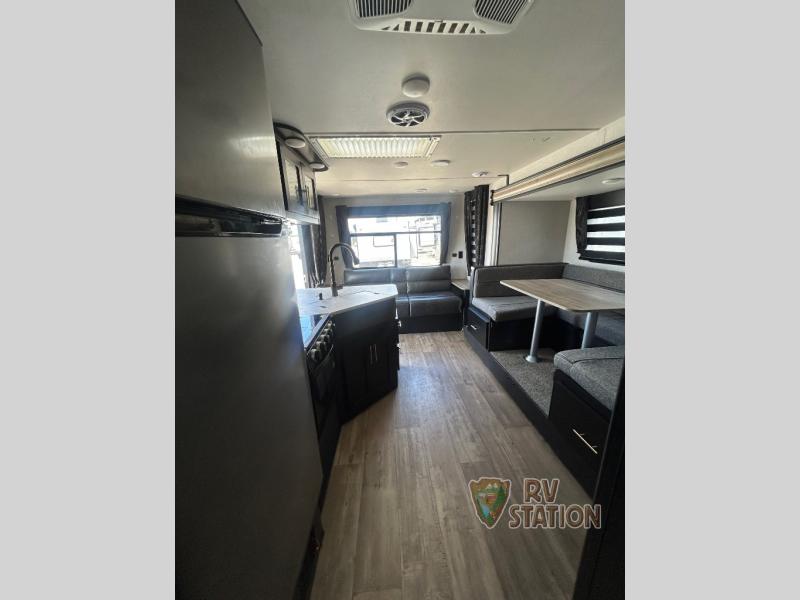 Inside, you'll find a smart layout featuring one slide-out that expands your living space, making it feel open and inviting. This travel trailer comfortably sleeps up to six people, thanks to its cozy sleeping arrangements. Whether you're traveling with family or friends, everyone will have a comfy spot to rest after a day of exploring. The interior is designed with convenience in mind, offering a fully-equipped kitchen, a snug dining area, and a relaxing lounge space.