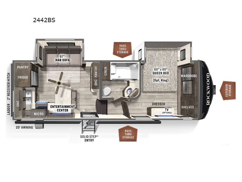 Measuring approximately 23 feet in length, the Rockwood Ultra Lite 2442BS is expertly crafted to provide ample space without compromising on maneuverability. Its two slide-outs significantly enhance the living area, creating a spacious and inviting environment for relaxation and entertainment. Whether you're hosting friends or enjoying a quiet evening with family, this RV comfortably sleeps up to four people, ensuring everyone has a cozy place to rest after a day of exploration.