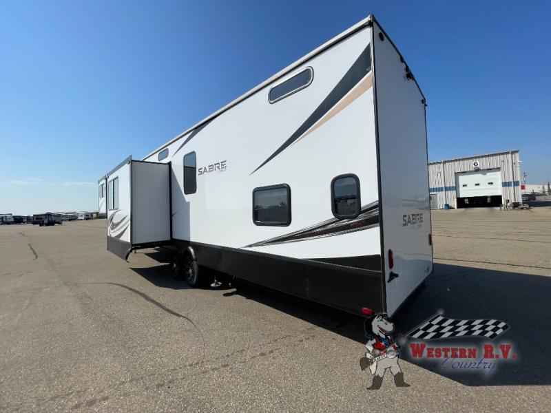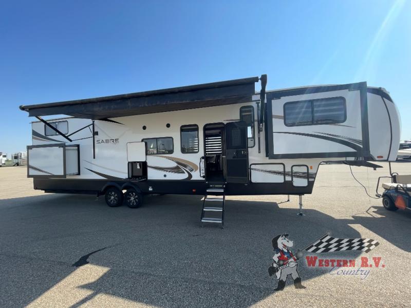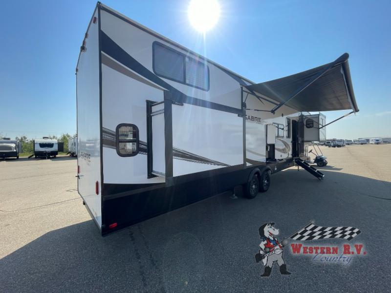 Discover the ultimate in comfort and adventure with the 2022 Forest River RV Sabre 37FLL Fifth Wheel! This spacious and stylish RV is perfect for families or groups looking to explore the great outdoors without sacrificing the comforts of home. With its impressive four slide-outs, this RV offers an expansive living space that can comfortably sleep up to eight people, making it ideal for family vacations or trips with friends.