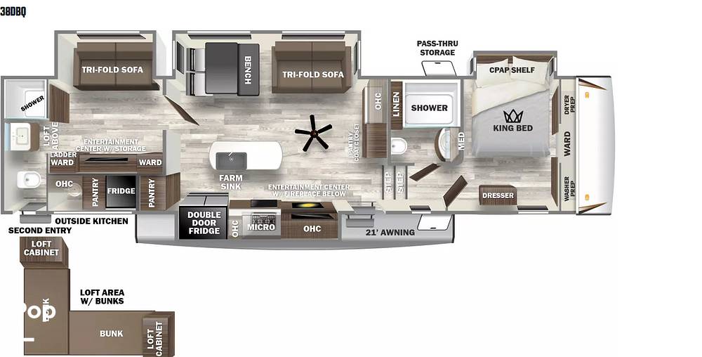 Step inside to find a thoughtfully designed interior that maximizes both style and functionality. The Sabre 38DBQ features a well-appointed kitchen equipped with modern appliances, ensuring you can prepare meals with ease. The living area is perfect for unwinding after a day of exploration, complete with comfortable seating and entertainment options. The RV boasts multiple sleeping areas, including a master suite, bunk beds, and convertible furniture, providing versatile sleeping arrangements for all your guests.