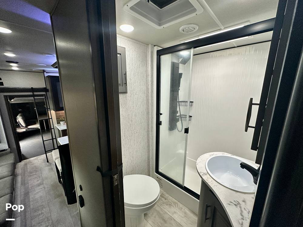 Measuring approximately 31 feet in length, the Momentum 349M provides ample space for everyone to relax and unwind. It comfortably sleeps up to seven people, making it perfect for family vacations or trips with friends. The interior is thoughtfully designed with modern amenities, including a fully-equipped kitchen, cozy sleeping areas, and a stylish living space that invites you to kick back and enjoy the journey. Whether you're cooking up a feast or enjoying a movie night, this RV has you covered.