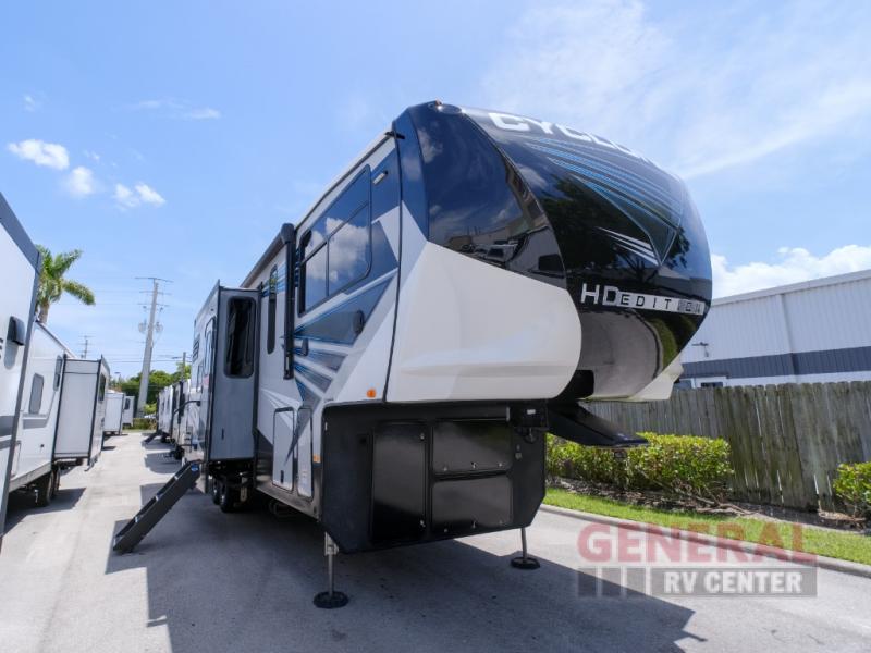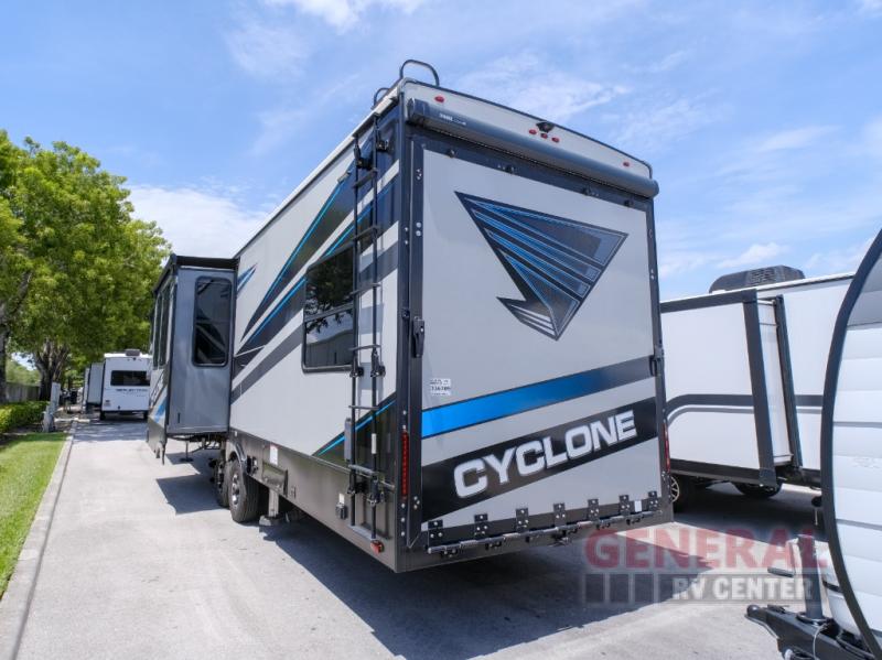 The Cyclone 3413 features three slide-outs, which significantly enhance the living space, providing a roomy and inviting environment. This RV can comfortably accommodate up to seven people, making it an ideal choice for family vacations or group excursions. The thoughtfully designed interior includes a well-appointed kitchen, a cozy living area, and sleeping quarters that ensure a restful night's sleep after a day of adventure. The attention to detail and quality craftsmanship are evident throughout, offering a home-away-from-home experience.