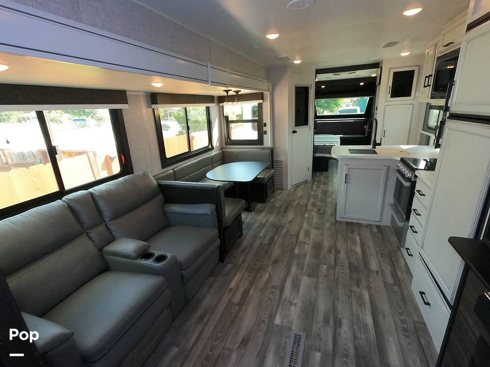 Inside, you'll find a well-designed layout that maximizes space and functionality. The living area is perfect for unwinding, with plush seating and a modern entertainment system. The kitchen is equipped with all the essentials, including a stove, microwave, and fridge, making it easy to whip up your favorite meals on the go. The bedroom offers a comfortable queen-sized bed, ensuring a good night's sleep under the stars. Plus, there's ample storage throughout the trailer, so you can bring along all your gear and essentials.