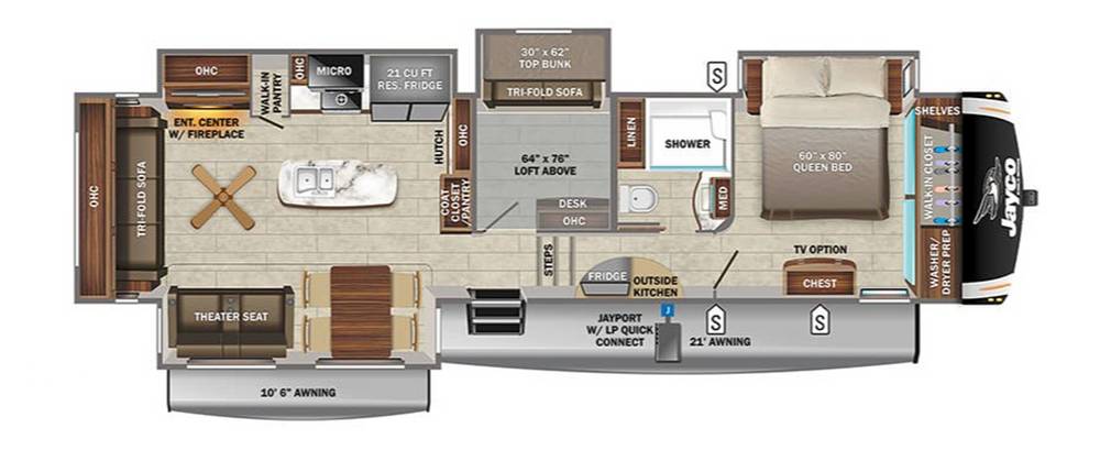 Outside, the Jayco Eagle boasts impressive features designed for convenience and enjoyment. The exterior includes a large awning, providing shade and shelter for outdoor gatherings. Ample storage compartments ensure you can bring along all your essentials without compromising on space. Built with durability in mind, this Fifth Wheel is ready to tackle any terrain, offering you the freedom to explore with confidence. Whether you're embarking on a weekend getaway or an extended road trip, the 2022 Jayco Eagle 355MBQS is your ticket to unforgettable adventures.