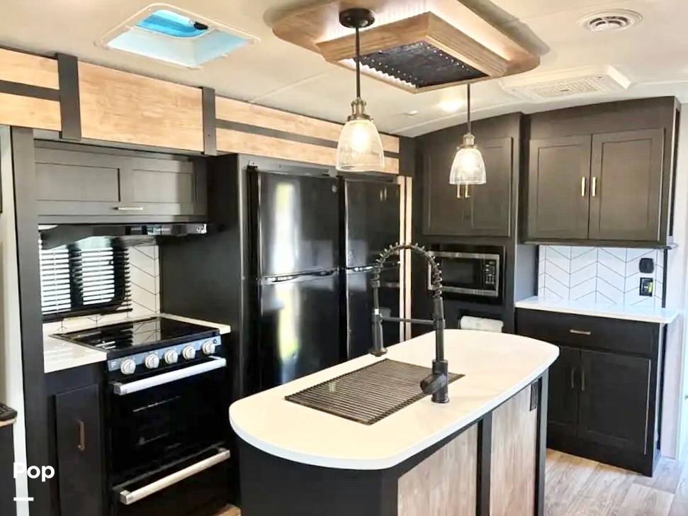 Step inside to find a beautifully appointed living area featuring plush seating and a modern entertainment system, perfect for unwinding after a day of adventure. The fully equipped kitchen boasts all the essentials, including a refrigerator, stove, and microwave, making meal prep a breeze. Enjoy your culinary creations at the stylish dinette, which also converts into additional sleeping space. The master bedroom offers a tranquil escape with a comfortable queen-sized bed and plenty of storage for all your travel essentials.