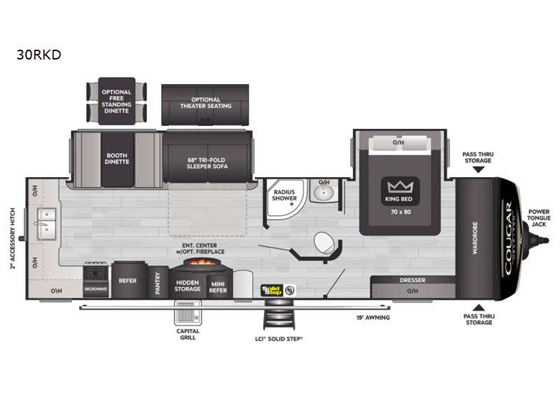 Measuring approximately 28 feet in length, the Cougar Half-Ton 30RKD offers ample space for relaxation and entertainment. The two slide-outs expand your living area, providing a roomy interior that feels like a home away from home. Whether you're embarking on a solo adventure or traveling with a companion, this RV comfortably sleeps up to three people, making it ideal for couples or small families. The well-appointed kitchen and cozy living area ensure you have everything you need to enjoy your travels in style.