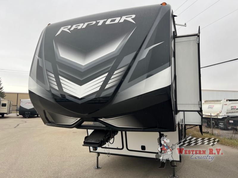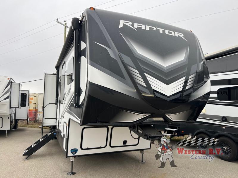Introducing the 2022 Keystone RV Raptor 429 Fifth Wheel, a pinnacle of luxury and functionality designed for the discerning traveler. This impressive RV features three slide-outs, providing ample space for comfort and convenience. With the ability to sleep up to eight people, it is perfect for family adventures or group excursions. The Raptor 429 combines modern amenities with a robust design, ensuring a seamless travel experience.