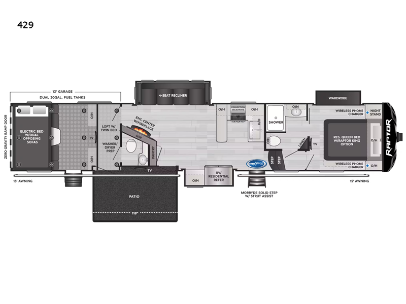 This RV is engineered for efficiency and performance, boasting a substantial fuel capacity of 227 liters, allowing for extended journeys without frequent refueling stops. Weighing in at 7,274 kilograms, the Raptor 429 is built with a sturdy frame that ensures stability and safety on the road. Its thoughtful design and high-quality construction make it a reliable choice for both short getaways and long-term travel.