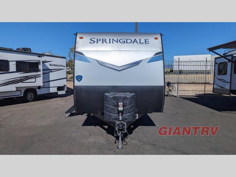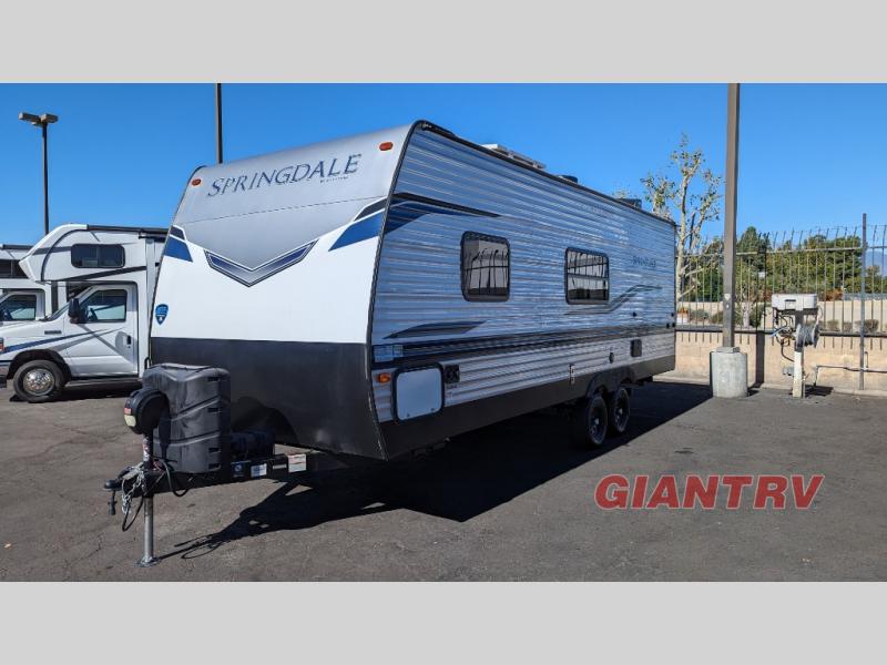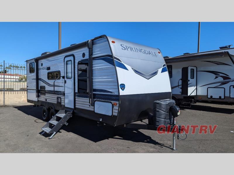 Introducing the 2022 Keystone RV Springdale 220BHWE Travel Trailer, a remarkable blend of comfort, functionality, and modern design. This travel trailer is an ideal choice for families or groups seeking adventure without sacrificing the comforts of home. With a length of 22 feet, it offers a spacious interior that can comfortably sleep up to seven people, making it perfect for family vacations or group outings.