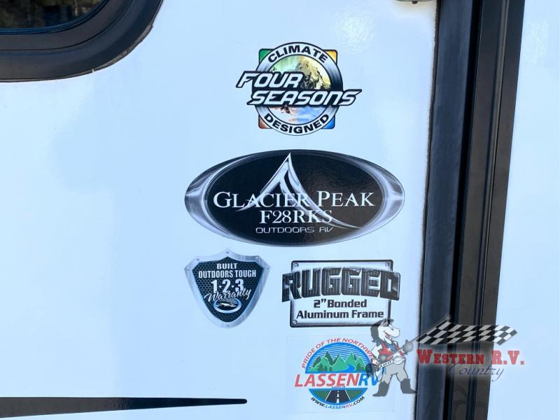 Built for all-season travel, this fifth wheel is equipped with superior insulation and a robust heating system, keeping you comfortable in any climate. With a fresh water capacity of 246 liters, a grey water capacity of 189 liters, and a black water capacity of 151 liters, you'll have plenty of resources for extended stays off the grid. Whether you're a seasoned traveler or new to the RV lifestyle, the 2022 Outdoors RV Glacier Peak Mountain Series F28RKS is your ticket to unforgettable adventures. Don't miss out on the opportunity to own this exceptional RV—your next journey awaits!