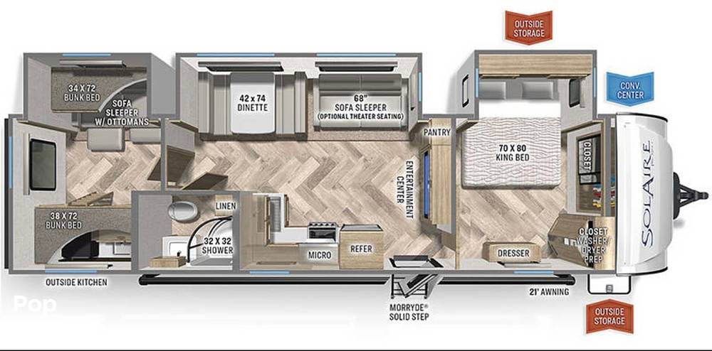 Step inside to find a thoughtfully designed interior that maximizes comfort and convenience. The SolAire Ultra-Lite features a fully equipped kitchen with modern appliances, allowing you to whip up your favorite meals on the go. The inviting living area is perfect for relaxing, with plenty of seating for everyone to gather and enjoy each other's company. The private master bedroom offers a peaceful retreat, while the bunkhouse provides a fun and functional space for kids or guests.