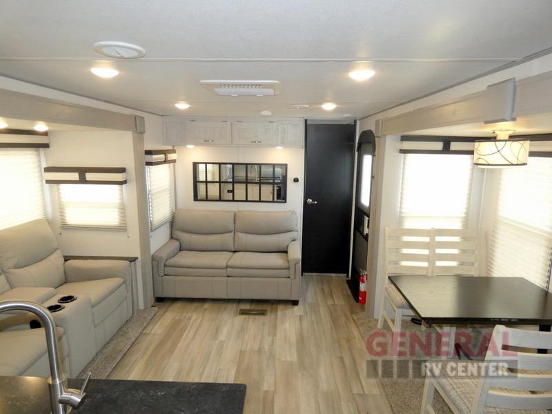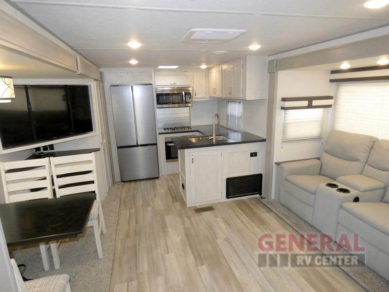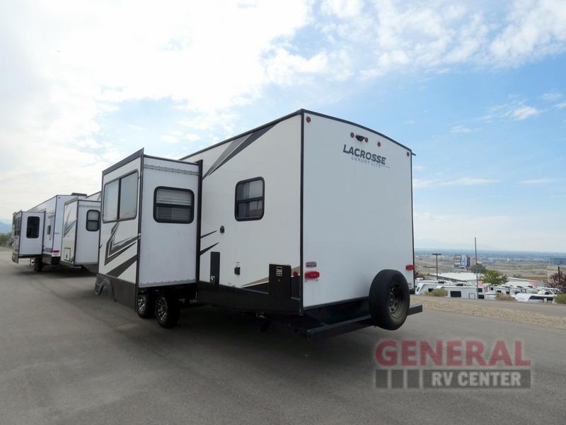 This beauty boasts three slide-outs, giving you extra room to stretch out and relax. Whether you're planning a weekend escape or a cross-country road trip, the LaCrosse 3411RK has got you covered. Inside, you'll find cozy sleeping arrangements for up to four people, perfect for a small family or a couple of friends. The rear kitchen layout is a chef's dream, equipped with modern appliances and ample counter space to whip up your favorite meals on the go.