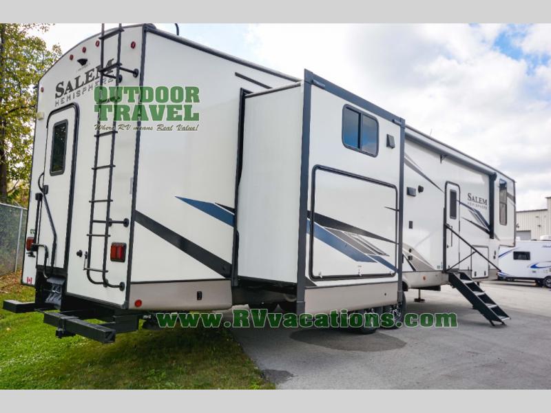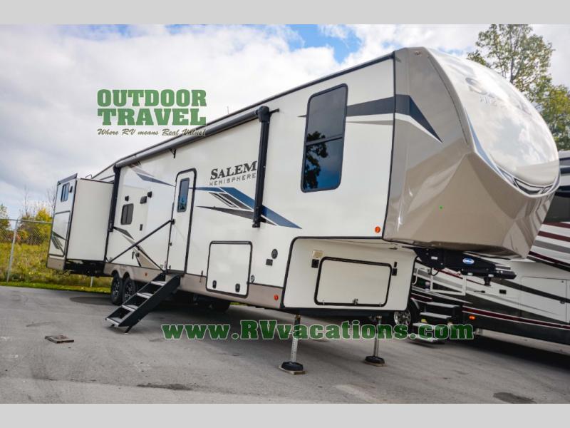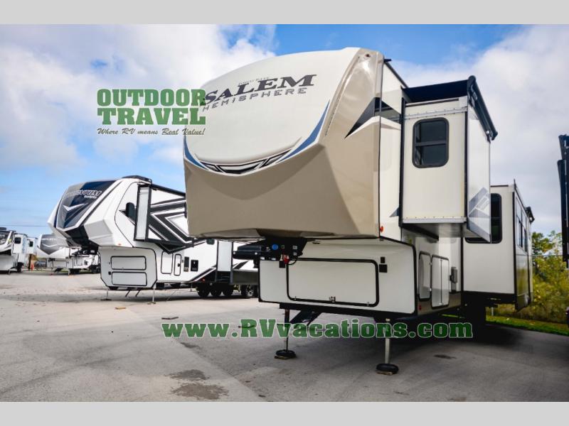 Discover the ultimate in luxury and comfort with the 2022 Salem Hemisphere 356QB Fifth Wheel, a masterpiece of modern RV design that promises to elevate your travel experiences. Measuring an impressive 43 feet in length, this fifth wheel offers an expansive living space that is perfect for families or groups seeking adventure without sacrificing the comforts of home. With its sleek exterior and high-end finishes, the Salem Hemisphere is sure to turn heads wherever your journey takes you.
