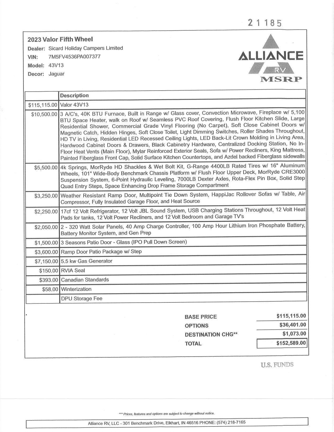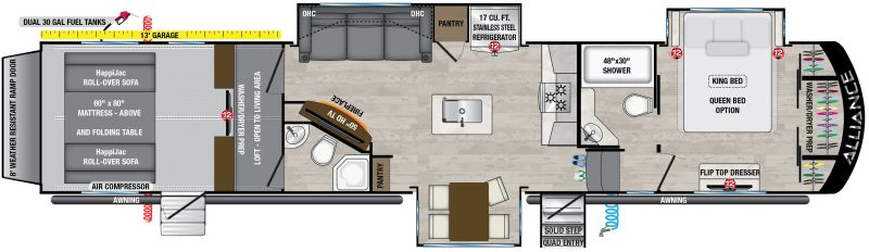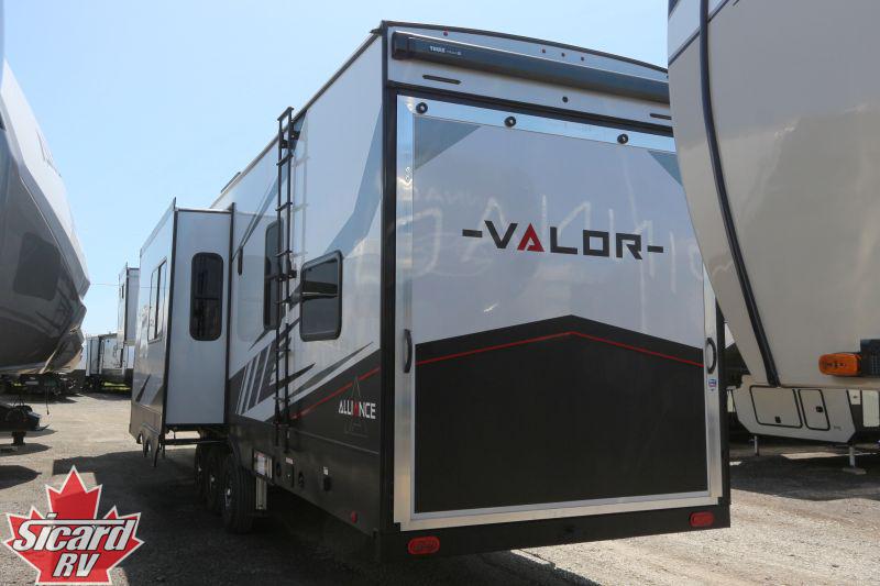 The 2022 Valor 43V13, by Alliance, will make weekend or month long camping trips leaving you wanting for more. This toy hauler fifth wheel features fireplace, a power lift bunk in the rear cargo bay & sleeps up to 8 people. Every Alliance RV is generously backed with a 3-year limited structural and 1-year limited base warranty. Start enjoying everything the RV lifestyle has to offer with a new RV from Sicard RV.Specifications:VIN: 7M5FV4536PA007377