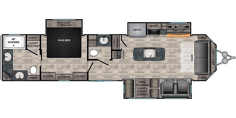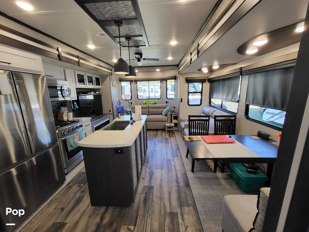 Measuring a generous 34 feet in length, this travel trailer is designed to give you room to stretch out and relax. Inside, you'll find a spacious living area with plush seating, a fully-equipped kitchen ready for your culinary creations, and a luxurious bathroom that feels like a spa retreat. The bedroom is a haven of comfort, ensuring you get a great night's sleep after a day of exploring.