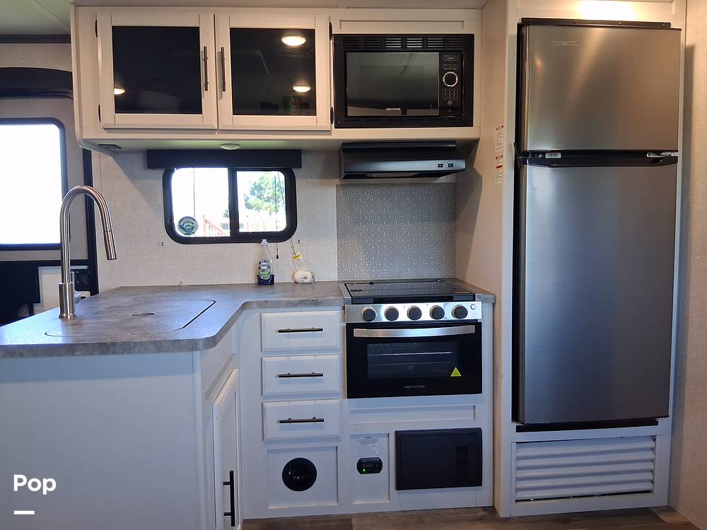 Outside, the Volante 34BH continues to impress with its durable construction and stylish design. The exterior is built to withstand the elements, ensuring your investment lasts for years to come. Additional features such as ample storage compartments and an easy-to-use awning enhance your outdoor living experience. Whether you're planning a weekend getaway or an extended road trip, the 2023 CrossRoads Volante 34BH Travel Trailer is your ticket to adventure, offering all the comforts of home while exploring the great outdoors.