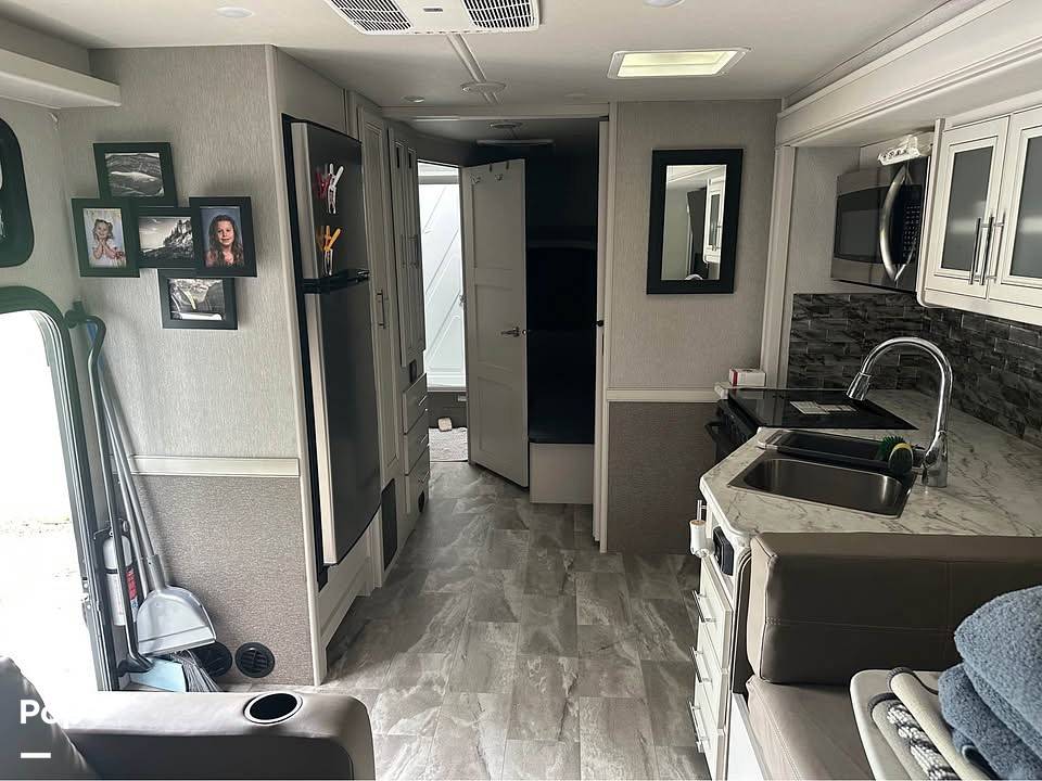 Inside, you'll find a thoughtfully designed interior that maximizes both functionality and comfort. The RV features a fully equipped kitchen with modern appliances, including a refrigerator, microwave, and stove, ensuring you can prepare meals just like at home. The living area is designed for relaxation, with a comfortable seating arrangement and a flat-screen TV for entertainment. Sleeping arrangements are versatile, with a master bedroom, convertible sofa beds, and a dinette that transforms into a bed, ensuring everyone has a cozy place to rest.