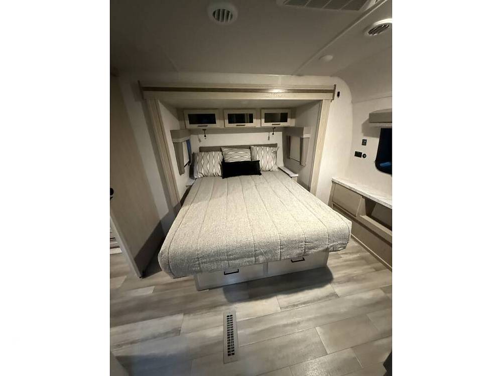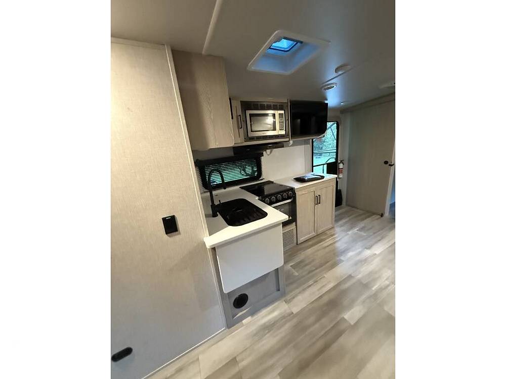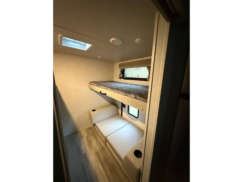 Measuring approximately 25 feet in length, this travel trailer is designed to provide ample living space without sacrificing maneuverability. Inside, you'll find a well-appointed interior featuring modern amenities and thoughtful design touches. The fully equipped kitchen comes with everything you need to prepare delicious meals on the road, while the cozy living area offers a perfect spot to relax and unwind after a day of adventure. The sleeping arrangements are versatile, ensuring everyone has a comfortable place to rest, with a master bedroom, bunk beds, and convertible sleeping spaces.