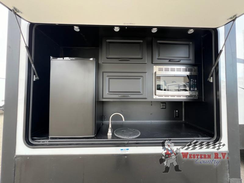 Weighing approximately 5,962 kilograms, this fifth wheel is robust yet designed for ease of towing, ensuring a smooth journey to your destination. The thoughtfully designed interior includes a well-appointed kitchen, complete with modern appliances and ample storage, allowing you to prepare meals with ease. The living area is equipped with plush seating and entertainment options, perfect for unwinding after a day of exploration. The sleeping quarters are designed to provide a restful retreat, with high-quality bedding and privacy features to ensure a good night's sleep for all occupants.