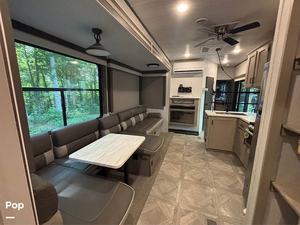 Step inside, and you'll be greeted by a modern and inviting interior. The living area is designed for relaxation, featuring plush seating and a large dining space where you can enjoy meals together. The kitchen is fully equipped with all the essentials, including a refrigerator, stove, and microwave, so you can whip up your favorite dishes no matter where you are. The bedrooms are cozy and private, ensuring a good night's sleep after a day of adventure. Plus, there's plenty of storage space to keep all your belongings organized and out of the way.