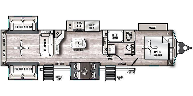 The Sandpiper 403RD boasts a meticulously crafted interior, featuring high-end finishes and thoughtful design elements that elevate your travel experience. The spacious living area is adorned with plush seating and a state-of-the-art entertainment system, ensuring relaxation and enjoyment during your journey. The well-appointed kitchen is equipped with modern appliances, ample storage, and elegant countertops, making meal preparation a delightful experience. The sleeping quarters offer a serene retreat, with cozy beds and ample storage to ensure a restful night's sleep.