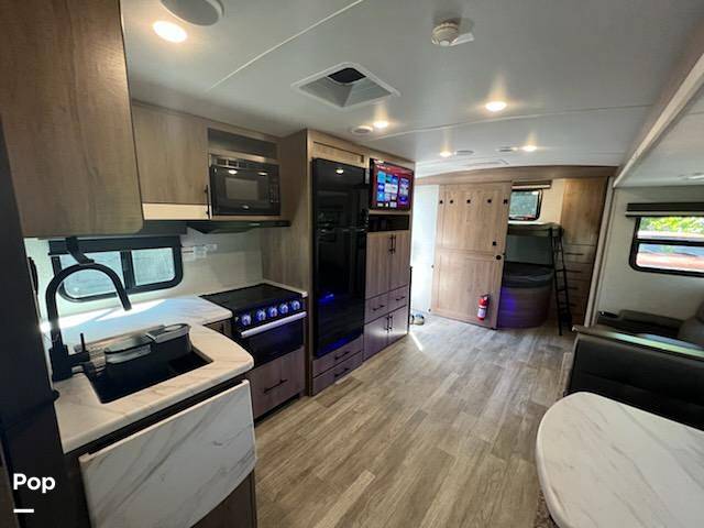 Step inside to find a beautifully appointed living area featuring high-quality finishes and thoughtful design elements. The kitchen is equipped with state-of-the-art appliances, including a large refrigerator, microwave, and three-burner stove, making meal preparation a breeze. The cozy dinette and plush seating area provide ample space for dining and entertainment, while the entertainment center ensures that rainy days are never dull. The private master bedroom offers a sanctuary of comfort with a queen-sized bed, while the bunkhouse provides additional sleeping quarters that kids and guests will love.