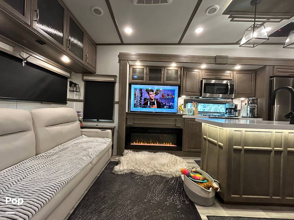 Inside, the Solitude 310GK-R comfortably sleeps four, making it perfect for family getaways or intimate retreats. The interior is thoughtfully designed with high-quality finishes and modern amenities to ensure a home-like atmosphere. The living area features plush seating and a state-of-the-art entertainment system, providing a cozy space to relax after a day of exploration. The kitchen is equipped with top-of-the-line appliances, ample storage, and a spacious dining area, making meal preparation a delight.