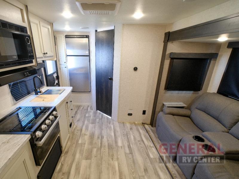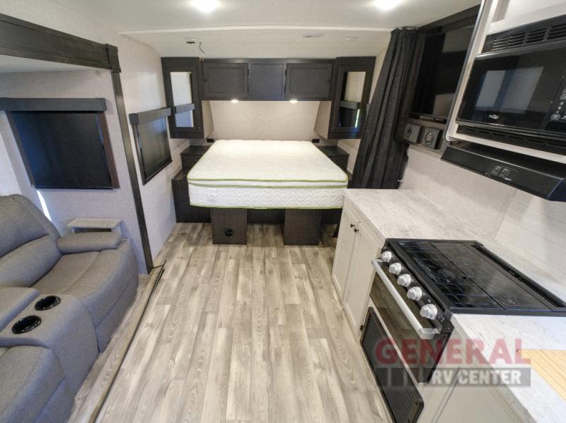 Step inside to find a thoughtfully designed interior that maximizes space and functionality. The single slide-out expands your living area, providing ample room to relax and unwind. The Range Lite 212FB comfortably sleeps two, offering a plush sleeping area that promises restful nights after a day of exploration. The modern kitchen is equipped with everything you need to whip up delicious meals on the go, while the stylish dinette offers a perfect spot to enjoy them.