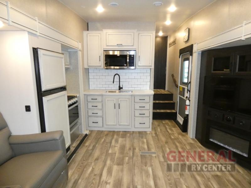 Step inside to find a thoughtfully designed interior that can comfortably sleep up to four people, ideal for families or couples seeking a cozy retreat. The two slide-outs significantly enhance the living space, providing a roomy and inviting atmosphere. Whether you're lounging in the plush seating area or preparing a meal in the fully equipped kitchen, every detail has been considered to ensure your comfort. The modern amenities and stylish finishes create an ambiance of luxury, making every moment spent inside a pleasure.