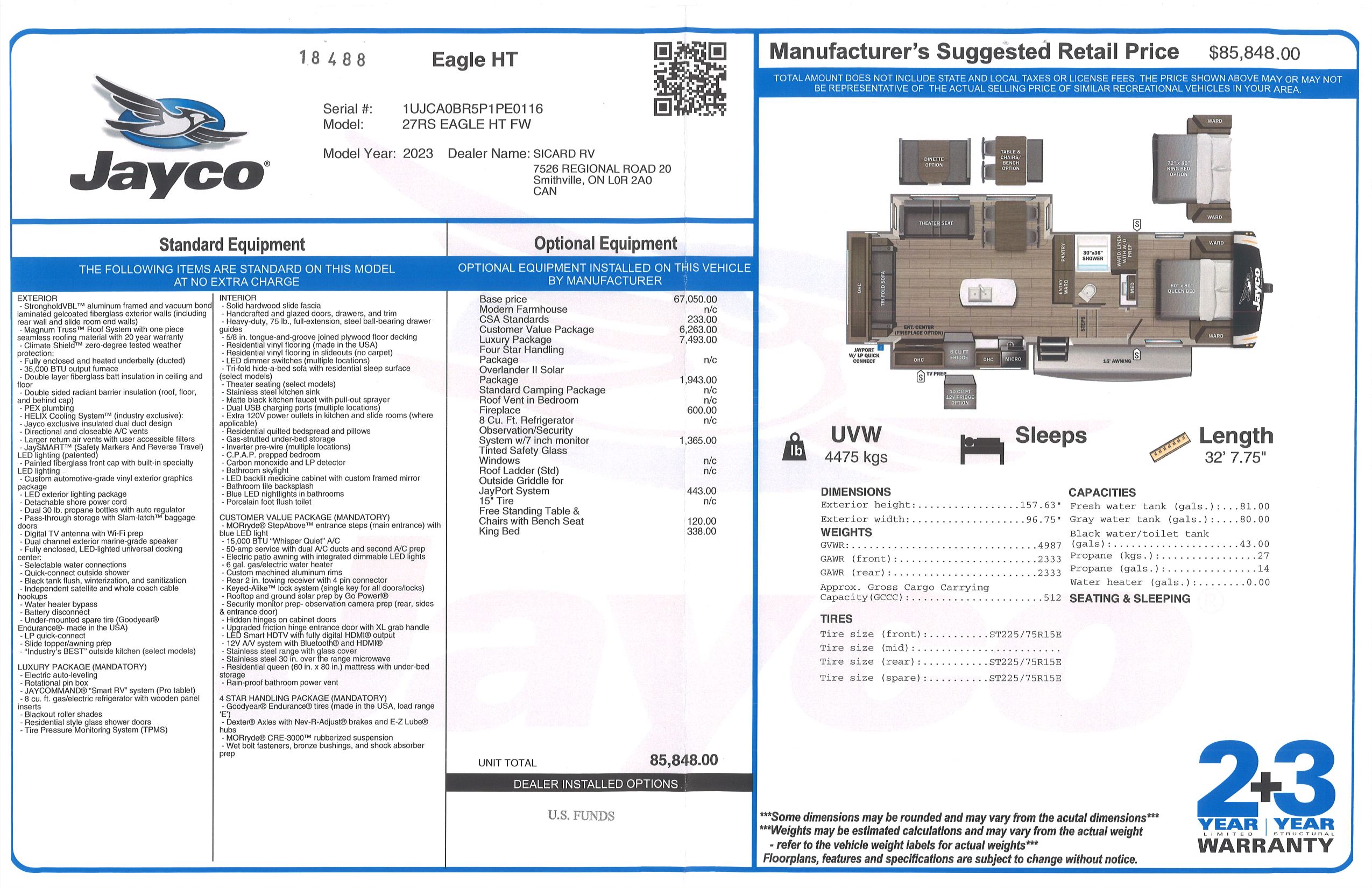 The 2023 Eagle HT 27RS, by Jayco, provide versatile living quarters with plenty of storage. This fifth wheel features a table and chairs dinette, a fireplace & sleeps up to 4 people. All Eagles are backed with a 2-year manufacturer limited factory warranty. Start enjoying everything the RV lifestyle has to offer with a new RV from Sicard RV.Specifications:VIN: 1UJCA0BR5P1PE0116