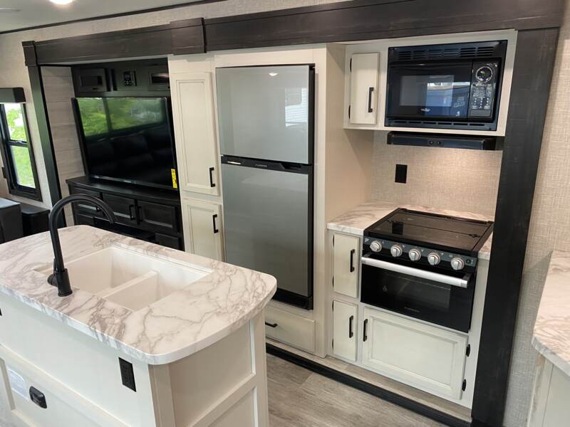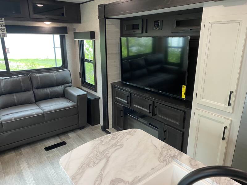 Step inside to discover a thoughtfully designed interior that maximizes space and comfort. The living area is equipped with premium furnishings, including a plush sofa and a spacious dining area, perfect for entertaining or enjoying a quiet meal. The kitchen is a chef's delight, featuring state-of-the-art appliances, generous counter space, and ample storage, ensuring you have everything you need to prepare meals on the go. The bedroom offers a serene retreat with a comfortable queen-sized bed and plenty of storage options, while the bathroom boasts modern fixtures and a spacious shower.