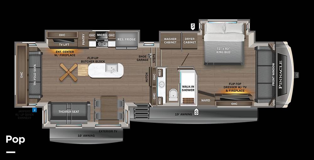 Inside, you'll find a beautifully appointed living area that comfortably sleeps four, ensuring everyone has a cozy place to rest after a day of adventure. The Pinnacle 36SSWS boasts a modern kitchen equipped with top-of-the-line appliances, perfect for preparing delicious meals on the go. The elegant dining area and plush seating create a welcoming atmosphere for family gatherings or quiet evenings in. The master bedroom offers a serene escape with a luxurious queen-sized bed and plenty of storage for all your essentials.
