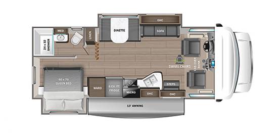 Step inside and you'll find a cozy interior that's designed for both comfort and convenience. The living area is perfect for relaxing after a day of exploring, and the kitchen is fully equipped with everything you need to whip up a delicious meal on the go. With plenty of storage space, you can bring along all your essentials without feeling cramped. The sleeping arrangements are versatile, with a queen-sized bed, convertible dinette, and a bunk over the cab, ensuring everyone has a comfy spot to rest.