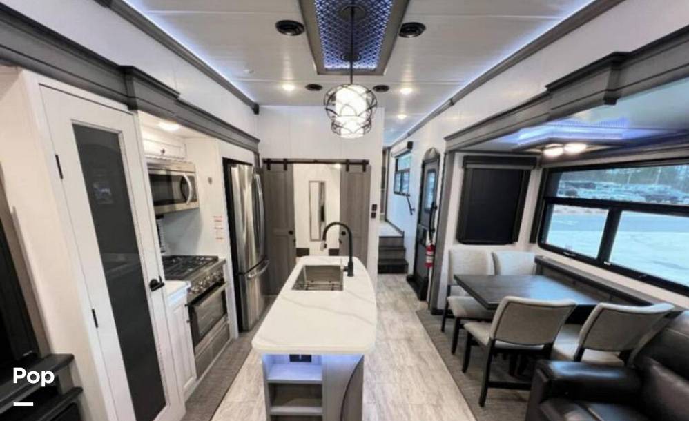 Step inside to find a beautifully appointed living area, featuring plush seating and a state-of-the-art entertainment system, perfect for relaxing after a day of exploration. The fully equipped kitchen boasts high-end appliances, including a large refrigerator, oven, and microwave, ensuring you can prepare all your favorite meals with ease. The elegant dining area provides the perfect setting for family meals or entertaining guests. The Montana 3857 BR also includes a luxurious master suite, complete with a king-size bed and ample storage, ensuring restful nights wherever you roam.