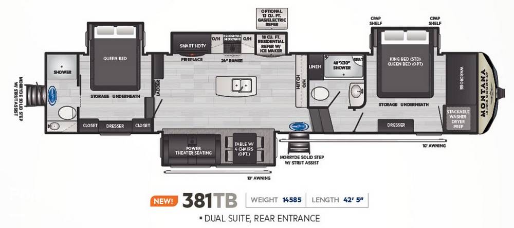 Step inside to find a thoughtfully designed interior that combines style with functionality. The Montana High Country 381TB features a well-appointed kitchen equipped with modern appliances, ensuring you can prepare meals with ease. The living area provides a cozy space to unwind, complete with comfortable seating and entertainment options. The sleeping arrangements include a master bedroom, bunk beds, and convertible furniture, ensuring everyone has a restful night's sleep.