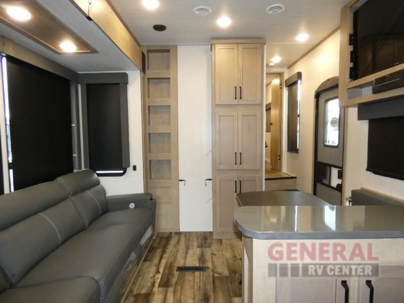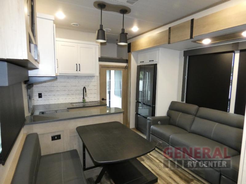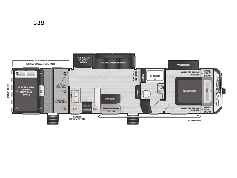 Introducing the 2023 Keystone RV Carbon 338 Fifth Wheel, a pinnacle of luxury and functionality designed for the discerning traveler. This exceptional RV offers a spacious and comfortable retreat with its two slide-outs, providing ample living space for families and groups. With the ability to sleep up to seven people, this model is perfect for family adventures or trips with friends. The Carbon 338 combines modern design with practical features, ensuring a memorable and comfortable journey.