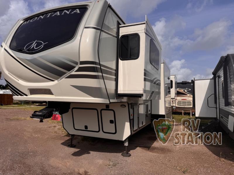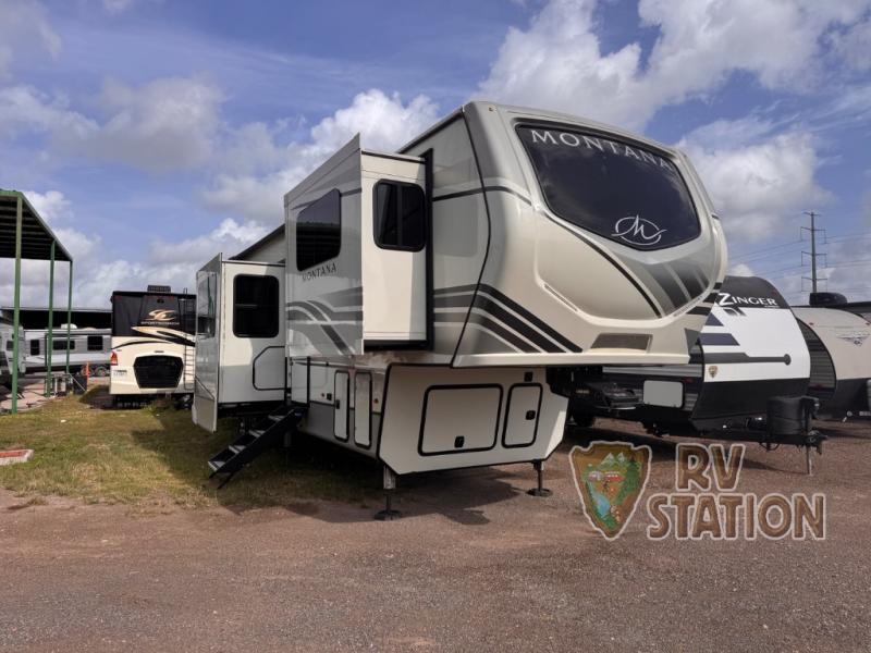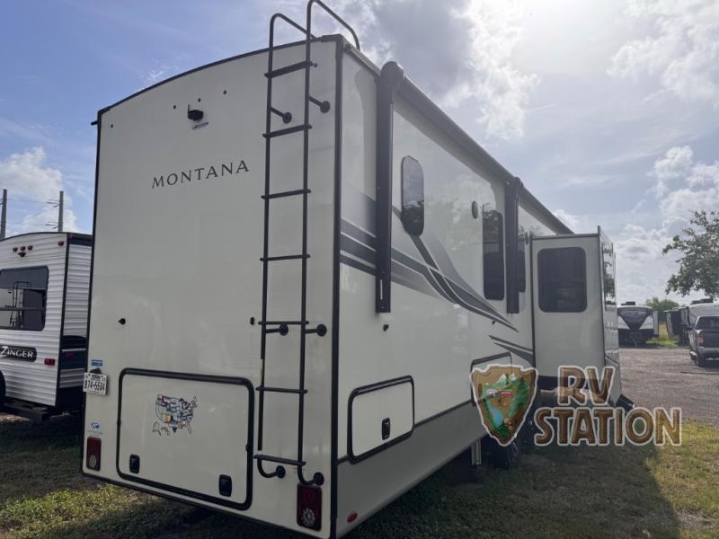 The Montana 3761FL features five slide-outs, maximizing your living space and providing an open, airy feel. Inside, you'll find sleeping accommodations for up to six people, ensuring everyone has a cozy place to rest after a day of adventure. The thoughtfully designed floor plan includes a front living area, complete with plush seating and a state-of-the-art entertainment system, ideal for unwinding after a long day. The fully equipped kitchen boasts modern appliances and ample counter space, making meal preparation a breeze.