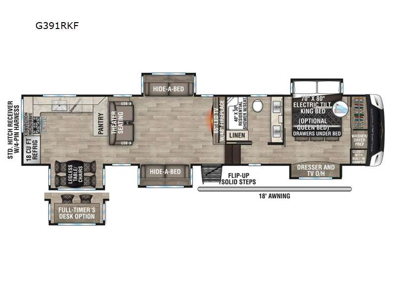 Inside, the Durango Gold G391RKF comfortably sleeps up to six people, ensuring everyone has a cozy place to rest after a day of exploration. The well-appointed interior features high-quality finishes and modern amenities, creating a home-like atmosphere on the road. Whether you're cooking in the fully equipped kitchen, relaxing in the spacious living area, or enjoying a restful night's sleep, this RV caters to all your needs.
