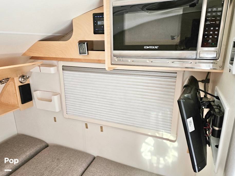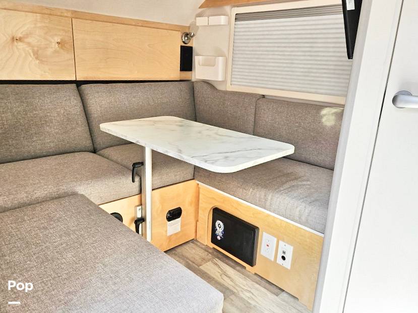 Inside, you’ll find a cozy and efficient space that comfortably sleeps two, perfect for couples or solo adventurers. The interior is thoughtfully designed with modern amenities, including a fully equipped kitchenette with a two-burner stove, a sink, and a refrigerator, allowing you to whip up your favorite meals on the go. The dinette area easily converts into a comfortable sleeping space, ensuring a restful night after a day of exploration. Plus, the wet bath with a shower and toilet adds an extra layer of convenience, making it easy to freshen up no matter where your journey takes you.