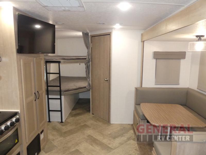 The SolAire 243BHS features a single slide-out that significantly enhances the interior space, providing a roomy and comfortable living area. It is thoughtfully designed to accommodate up to eight people, ensuring that everyone can enjoy a restful night's sleep. The intelligently designed floor plan includes a queen-sized bed, double bunk beds, and a convertible dinette, offering versatile sleeping arrangements to suit your needs.