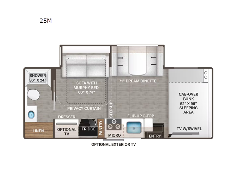 Designed to sleep up to five people, this RV is perfect for family getaways or trips with friends. The interior is thoughtfully laid out to maximize comfort and convenience, featuring a well-equipped kitchen, a cozy dinette, and a comfortable sleeping area. The modern amenities ensure that you have everything you need on the road, from cooking appliances to entertainment options, making every journey enjoyable and stress-free.