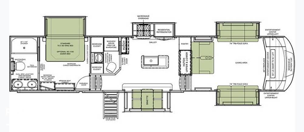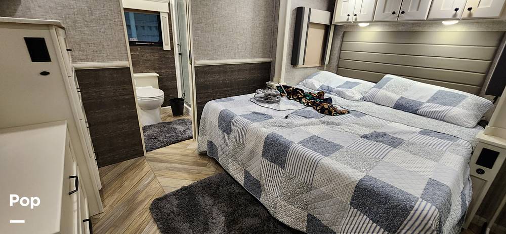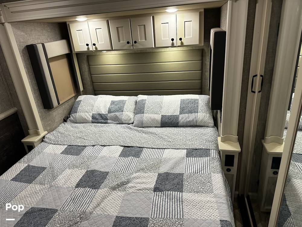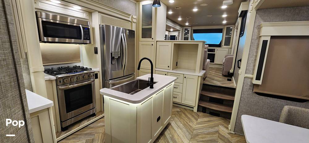 Step inside to discover a meticulously crafted interior that boasts high-quality finishes and thoughtful design elements. The living area is a true highlight, featuring plush seating arrangements and a state-of-the-art entertainment system, perfect for unwinding after a day of adventure. The kitchen is equipped with modern appliances, including a full-sized refrigerator, stove, and microwave, allowing you to prepare gourmet meals with ease. The dining area provides a comfortable space for family meals or intimate gatherings.
