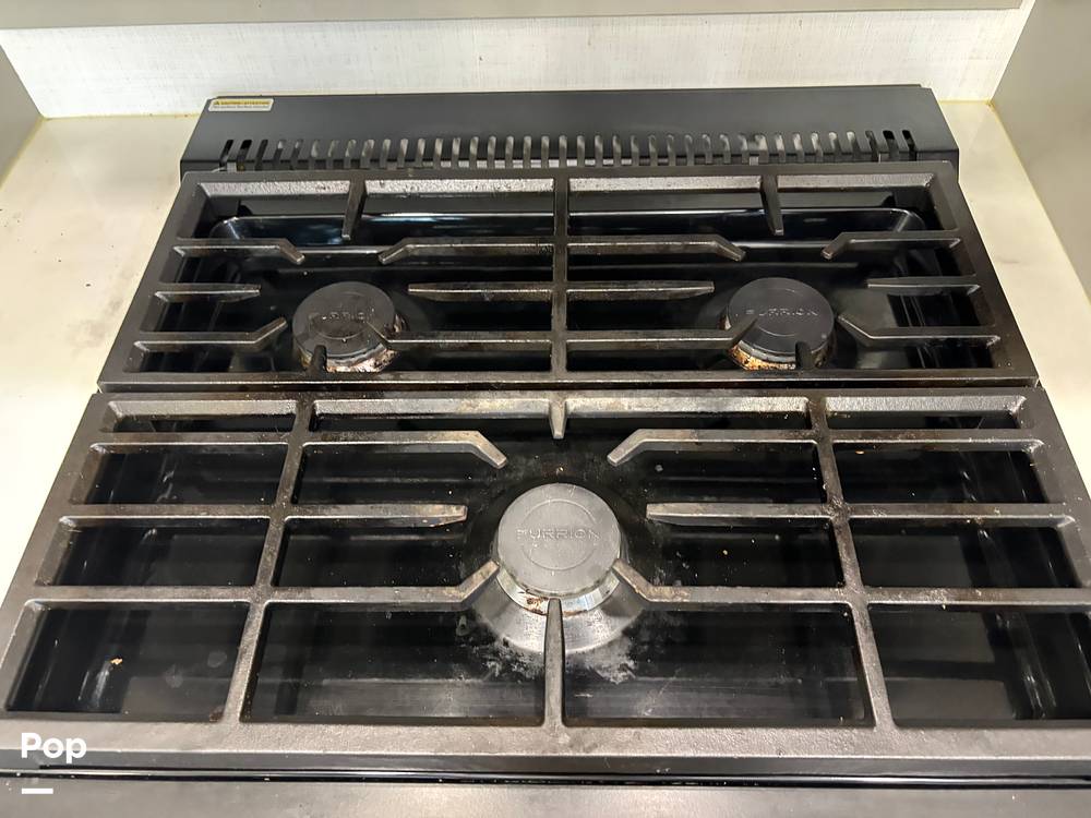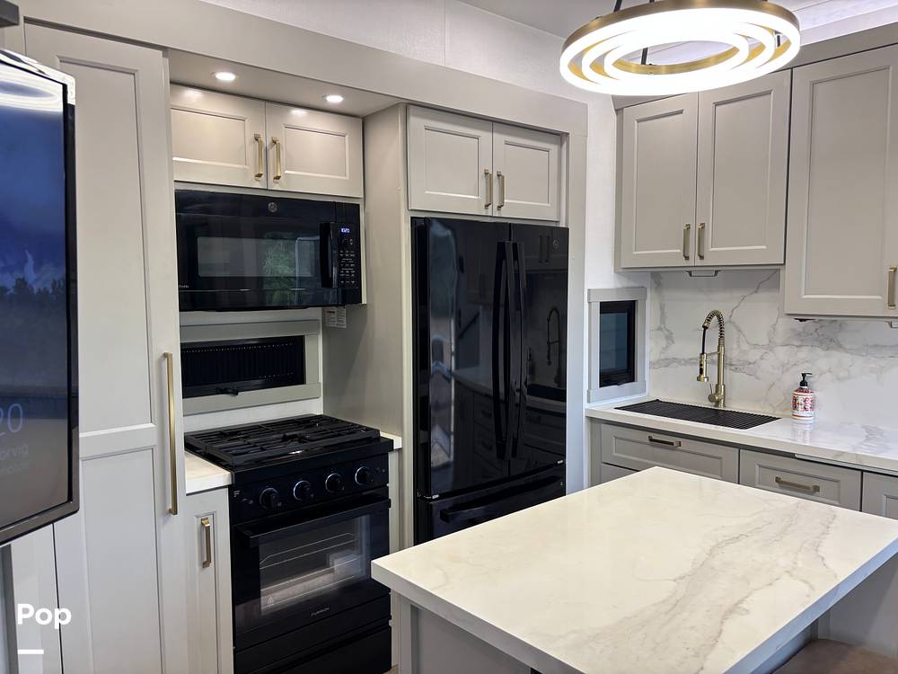 Measuring an impressive 34 feet in length, this fifth wheel offers ample space for relaxation and entertainment. Inside, you'll find a well-appointed living area with plush seating and a state-of-the-art entertainment system, making it an ideal space for unwinding after a day of exploration. The kitchen is equipped with modern appliances and generous storage, allowing you to prepare meals with ease. The sleeping arrangements are thoughtfully designed, featuring a master bedroom, bunk beds, and convertible sleeping spaces to ensure everyone has a comfortable place to rest.