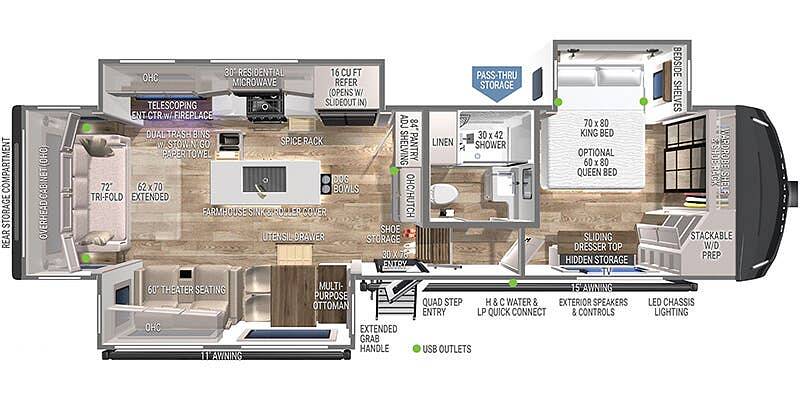Step inside, and you'll be greeted by a stylish and modern interior that boasts all the amenities you could wish for. The living area is designed for relaxation, featuring plush seating and a state-of-the-art entertainment system. The kitchen is a chef's dream, equipped with top-of-the-line appliances and ample counter space to whip up your favorite meals. And when it's time to rest, the sleeping quarters offer a peaceful retreat with comfortable bedding and plenty of storage for all your belongings.