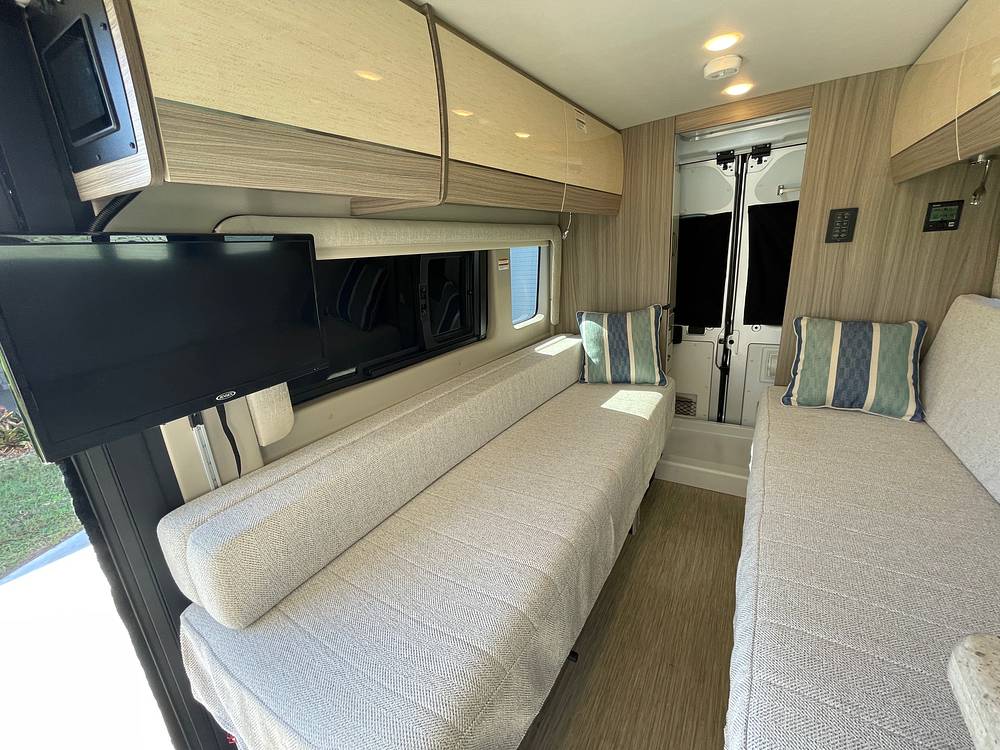Inside, the Ethos 20T is thoughtfully designed to maximize space and utility. The interior features high-quality materials and finishes, creating a sophisticated and inviting atmosphere. The sleeping area comfortably accommodates two, ensuring restful nights after a day of adventure. The kitchen is equipped with modern appliances, including a refrigerator, microwave, and cooktop, allowing you to prepare meals with ease. The bathroom is compact yet efficient, featuring a shower, toilet, and sink, ensuring all the comforts of home are at your fingertips.